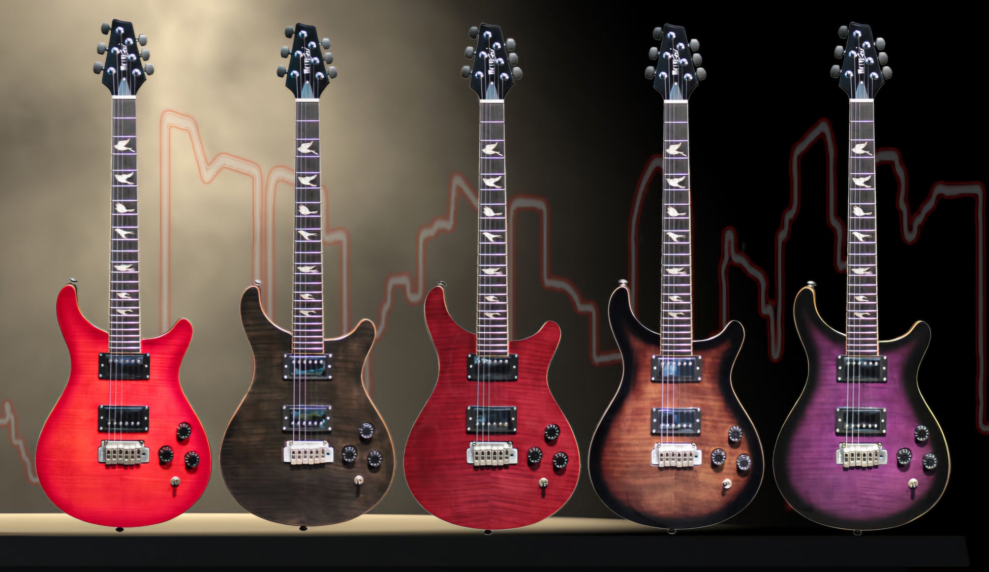 Dual cutaway Flame-maplePurpleSunBurst (FPSB) Top, with solid Mahogany body, Wilkinson 2H X 2 PickUps with steel plates cover, Wilkinson Tremolo Bridge, elegant doves inlays fretmarks. Ebony head machines to match the head stock style.